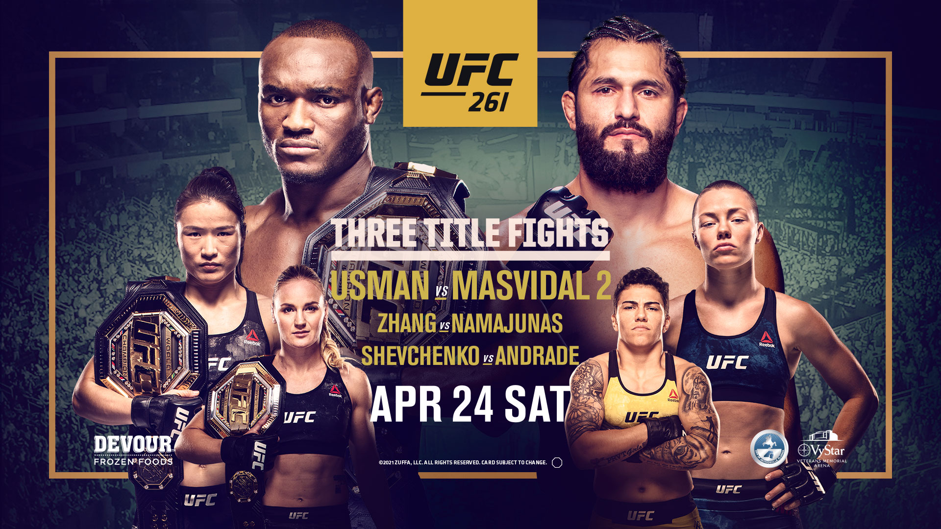 Apr 19 2021 Next weekend sees the long-awaited rematch between Kamaru Usman and Jorge Masvidal for the welterweight title at UFC 261. Mar 17 2021 UFC 261 fight card. Masvidal 2 fight card and free live stream Heres everything you need to know ahead of fight night in Jacksonville.